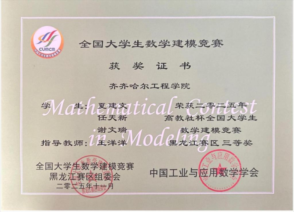 近日,全国大学生数学建模竞赛黑龙江省赛区获奖名单揭晓。威尼斯官网学子在激烈角逐中脱颖而出,共荣获省级二等奖1项、三等奖2项,充分展现了学校学生扎实的数学基础、严谨的逻辑思维、出色的团队协作与创新能力。此次竞赛黑龙江省赛区吸引了哈尔滨工业大学、哈尔滨工程大学等40余所高校参与。接到竞赛通知后,学校通过选拔,从300余名参赛学生中遴选出27人,组成9支队伍代表学校参加省赛。经过黑龙江省赛区组委会专家的严格评审,...