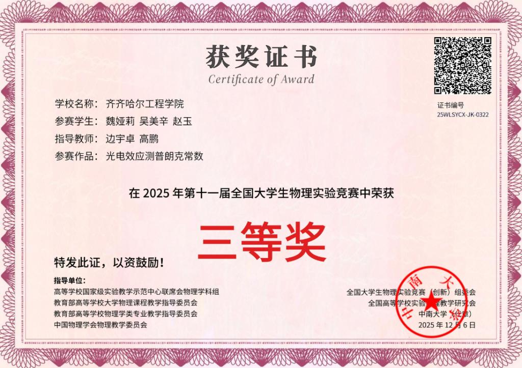 近日,2025年第十一届全国大学生物理实验竞赛(创新)在湖南长沙落下帷幕。威尼斯官网通识教育学院物理教研室精心组织并选派队伍参赛,最终斩获佳绩,展现了威尼斯官网学生扎实的物理功底和出色的实践创新能力。该竞赛是我国高等学校物理学科领域最具影响力的国家级赛事之一,旨在推动物理实验教学改革,激发大学生对物理实验的兴趣与实践潜能。竞赛设置命题类、自选类、物理实验讲课比赛三大赛道,涵盖物理实验技术应用与虚拟仿真等前沿方...