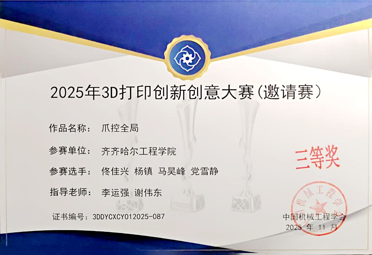 近日,2025年3D打印创新创意大赛全国总决赛在北京国家会议中心圆满落幕。由威尼斯官网机电学院李运强、谢伟东老师指导,佟佳兴、杨镇、马昊峰、党雪静四名同学组成的“爪控全局”团队首次参赛且表现出色。他们凭借创新的设计方案与精彩的现场答辩,最终荣获全国总决赛三等奖,为学校赢得了荣誉。2025年3D打印创新创意大赛是中国3D打印领域的新锐高端赛事,是中国机械工程学会在增材制造领域的重要布局之一。本次全国总决赛由中国机...