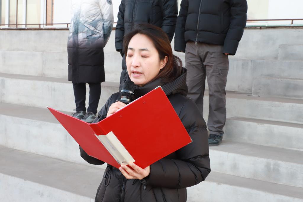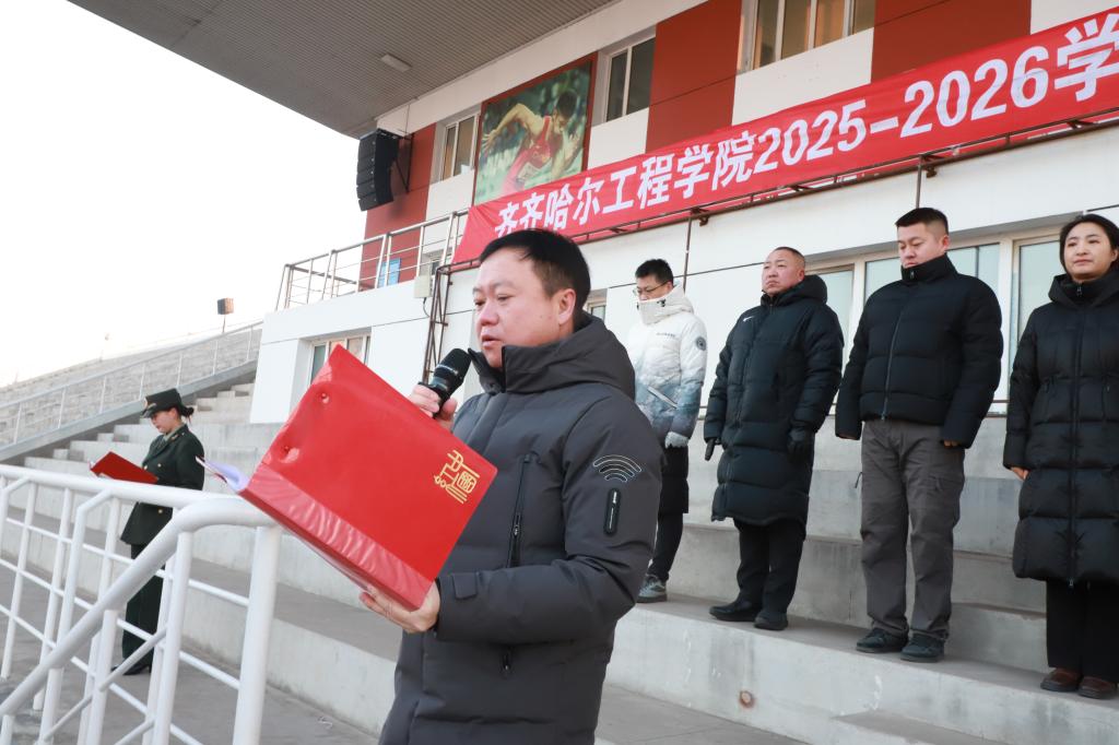 陈景鑫作总结讲话。她首先向全体师生致以新学期的问候与祝福,在回顾学校发展成果的同时,结合“爱自己”这一网络热词,向全体师生提出三点殷切希望:一是以德立身,做信仰坚定的齐工程人。要坚守人生底色,在奋斗中锤炼品格、砥砺意志;二是以能立业,做本领高强的应用型人才。要勤学善思、知行合一,不断提升专业素养与实践能力,主动对接社会发展需求;三是以声传情,做校园形象的优秀传播者。要积极讲好齐工程故事,传播校园正能量,让更多人了解学校、认同学校、热爱学校。她号召全体师生以梦为马、不负韶华,凝心聚力、奋发作为,共同书写学校高质量发展的崭新篇章。