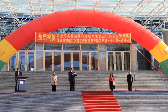 学生代表向市先进集体代表冯伟和市劳动模范张静献上鲜花。两位老师在热烈的锣鼓声中,带着全校师生的祝福和期待前往齐市工人文化宫,参加齐齐哈尔市第三十四届劳动模范表彰大会。