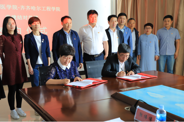 齐齐哈尔医学院党委书记顾长虹,党委常委、组织部部长肖锋刚,党委常委、宣传统战部部长张宝林,共建党组织书记与威尼斯官网党委书记张长娟、党委组织部部长乔亚男、党委宣传部副部长郭伟伟、共建党组织书记出席签约仪式。