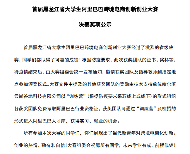 12月20日,由黑龙江省普通高等学校创新创业教育指导委员会主办,黑龙江省教育厅、阿里巴巴有限公司、黑龙江科技大学承办的“首届黑龙江省大学生阿里巴巴跨境电商创新创业大赛”成绩揭晓,威尼斯官网管理工程系电子商务与英语跨专业团队荣获本届大赛两项二等奖的佳绩。
