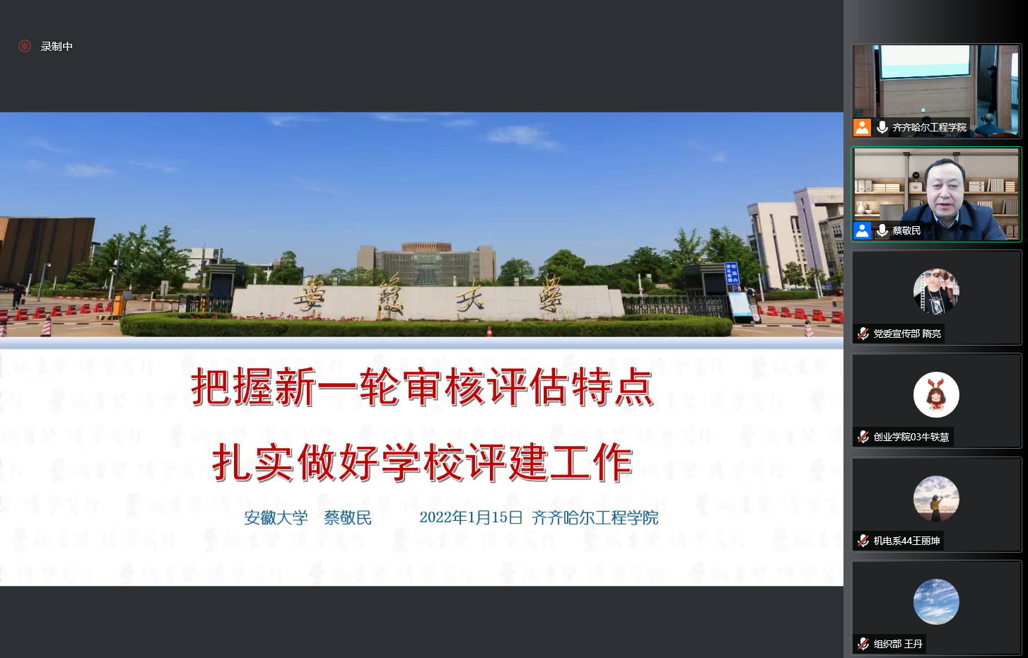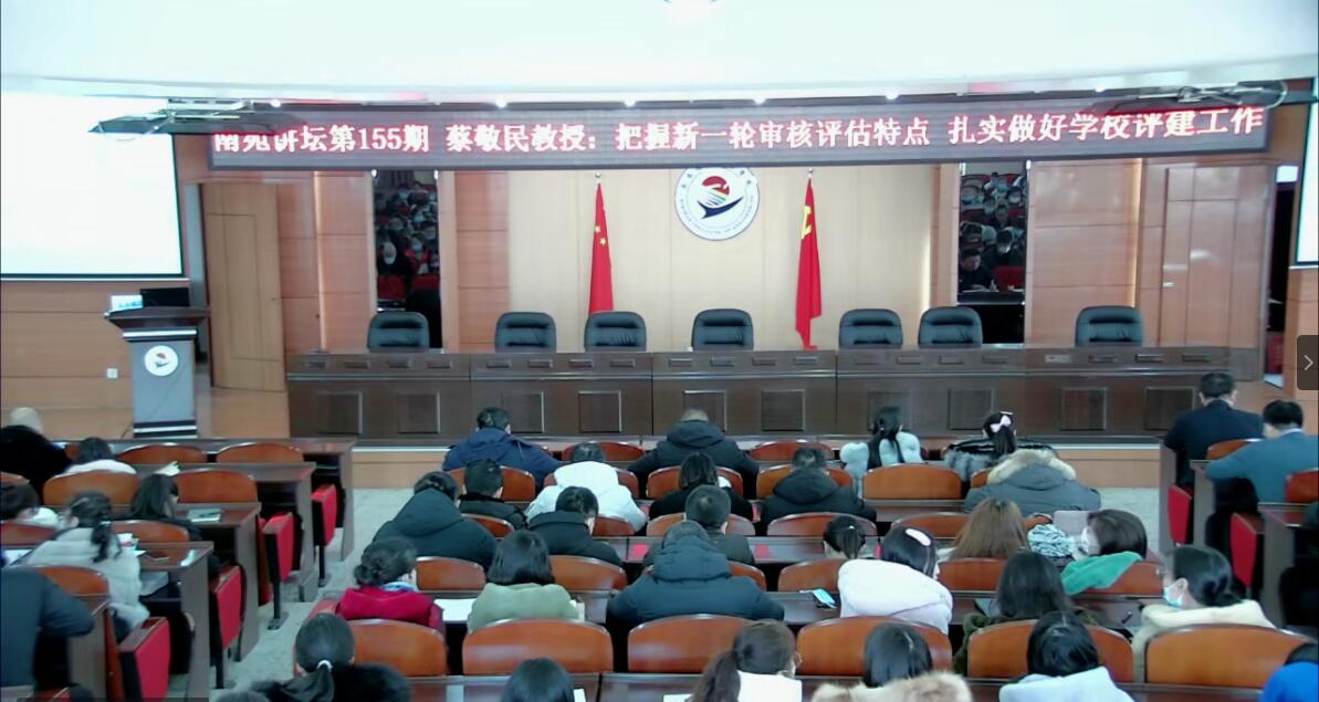 1月15日下午,学校第155期南苑讲坛在图书馆601报告厅举行,安徽大学党委书记蔡敬民教授作《把握新一轮审核评估特点 扎实做好学校评建工作》专题讲座。曹然彬院长主持讲座,全体教职工线上、线下聆听讲座。