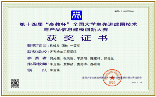 “高教杯”全国大学生先进成图技术与产品信息建模创新大赛是工程图学最高级别的国家级赛事,被誉为“图学界的奥林匹克”。学校机电工程系成图工作室参赛团队于2021年1月20日开始筹备此次大赛,继2020年获得全国二等奖和2021年5月份获得全省一等奖后,终于实现了摘得全国一等奖的目标。