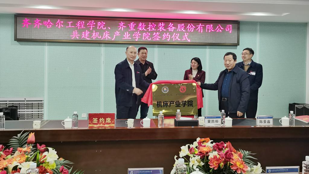 院长曹然彬与齐重数控装备股份有限公司总经理孙伟代表校企双方签署《机床产业学院校企共建框架协议书》,并为齐齐哈尔机床产业学院揭牌,标志着全国机床制造业首家机床产业学院正式成立!