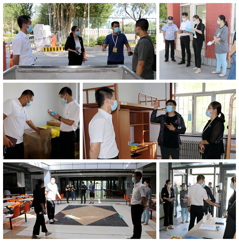 校领导以及学工处、总务处、保卫处等部门负责人组成第一检查组,重点检查疫情防控工作落实。在学校南门,详细了解了进门扫码、测温、登记和开学入校的程序等情况;在11公寓,检查了“手消”测温设备,并现场向值班工作人员询问了准备情况;在六公寓,重点查看了临时隔离室的布置与防疫用品的准备情况;在三味餐厅,着重对环境卫生等进行检查指导;在北门,查看了提示牌与登记表;在三号教学区,重点检查了防疫物资库房,对储备进行了解与盘点。