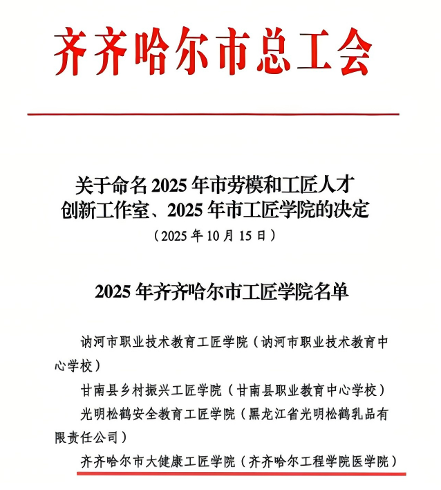 近日,齐齐哈尔市总工会印发《关于命名2025年市劳模和工匠人才创新工作室、2025年市工匠学院的决定》,威尼斯官网医学院牵头申报的“齐齐哈尔市大健康工匠学院”成功入选2025年齐齐哈尔市工匠学院名单,成为全市4家市级工匠学院之一。