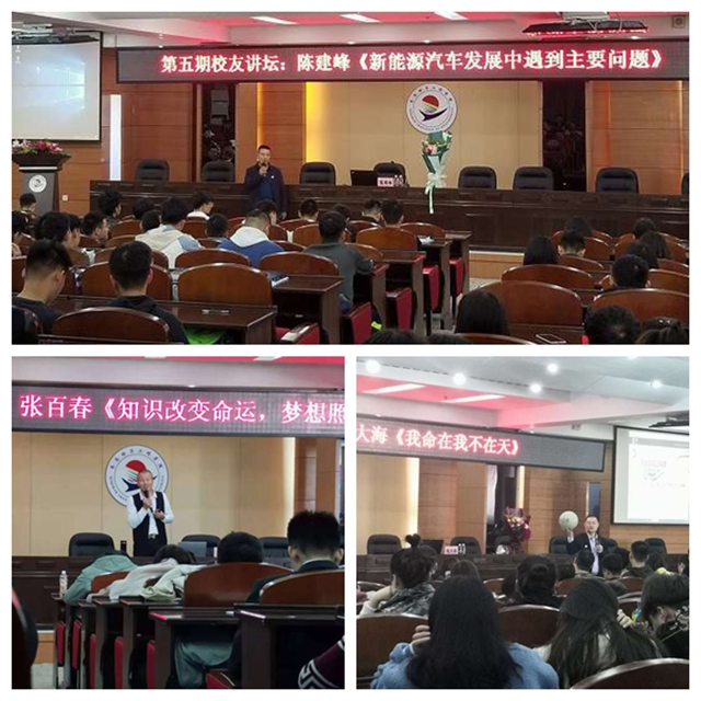在所举办的共四期校友讲坛上,2005级数控专业校友、大连核电装备公司机加分部班组长、2019年荣获中国一重大连核电装备公司“五一劳动模范称号”和大连核电装备公司第一季度“基层创新二等奖”的李晓东,1997级计算机专业校友、北京百纳友为公司董事长张百春,1995级文秘专业校友、弘乐教育集团联合创始人及董事会董事、集团营销副总裁、弘乐集团全国总经理赵大海,1997级文秘专业校友、河北石家庄翼帆能创始人陈建峰,分别以《让人生每段历程都绽放光芒》《知识改变命运,梦想照亮人生》《我命在我不在天》《新能源汽车发展中遇到的主要问题》为题做汇报演讲。校友会、团委组织的“第一期学长说”,邀请赵大海校友作《读书与写作》讲座。校友们以自己的经历和业绩与学弟学妹分享创业感悟,抒发对母校培养教育的感恩之情。