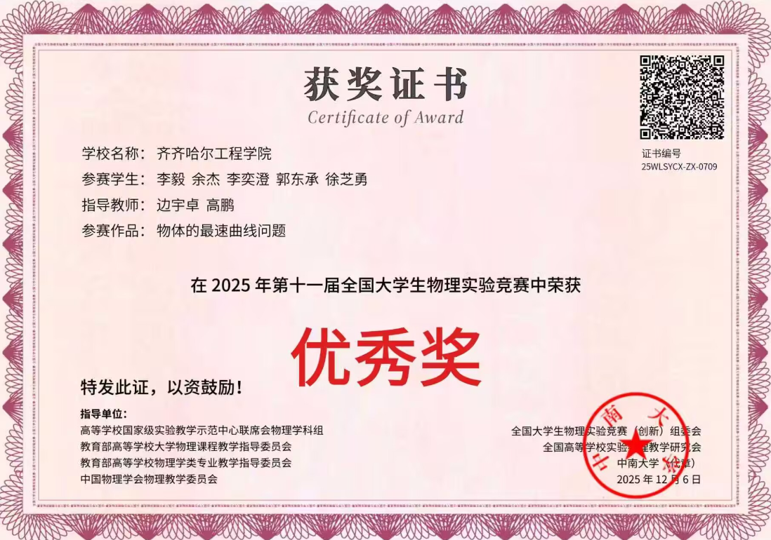 此次佳绩不仅是对参赛同学辛勤付出的肯定,也充分体现了物理教研室“以赛促教、以赛促学”的教学成效。未来,物理教研室将继续深化物理实验教学改革,依托学科竞赛平台,进一步提升学生创新实践能力,为培养高素质创新型人才奠定更坚实的基础。