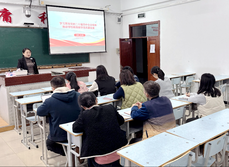 张静“学习贯彻党的二十届四中全会精神,推动学校教育教学高质量发展”为题,围绕党的二十届四中全会的重大意义、核心要义和实践要求进行了深入解读重点阐述了全会提出的“统筹教育强国、科技强国、人才强国建设”部署,结合学校发展实际,系统分析了全会精神对教育教学高质量发展的指引作用。