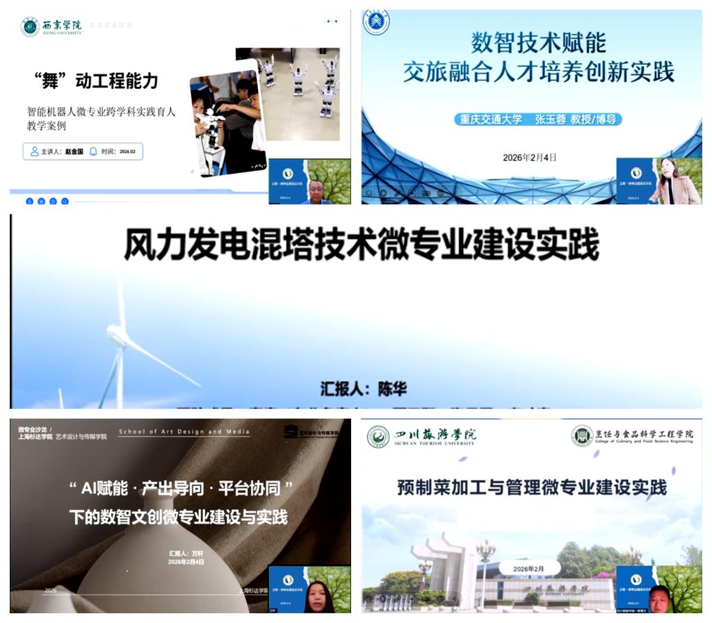 来自南宁学院、重庆交通大学上海杉达学院西京学院四川旅游学院的五位老师分别分享了风力发电混塔技术数智交通旅游、数智文创智能机器人以及预制菜加工与管理微专业建设实践各院校代表分享了各自微专业建设的特色与亮点。大家立足区域产业发展实际,将真实项目、场景与标准深度融入教学,共同印证了一个共识:微专业不是“小而全”的拼盘,而是“专而精”的靶向供给;不是短期培训的翻版,而是产教融合纵深发展的战略支点。
