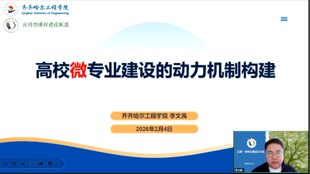 学校教务处处长李文禹作题为《高校微专业建设的动力机制构建》的经验分享,从微专业的核心使命、动力机制、培养方案以及质保体系等四个方面介绍齐工程微专业建设方案,探讨了以“四真三化(FT)”课程建设模式为理论基础的微专业建设动力机制,即面向国家战略引导与产业升级需求开发微专业,围绕学校教育教学创新管理微专业。最后,他提出学校微专业建设应从“校内自主”转向“企业定制”,深度融入产业发展,真正做到想企业之所想、急企业之所急、帮企业之所需。