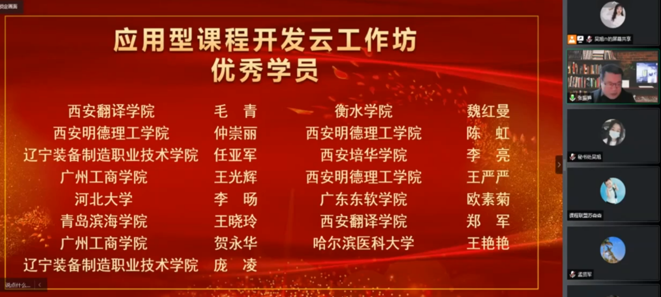 12月13日晚上,首期应用型课程开发云工作坊结业式在线举办,全体参训学员、指导教师线上参会,400余位其他院校教师参与互动,应用型课程建设联盟秘书长张振笋主持会议。 应用型课程建设联盟秘书长张振笋做题为...