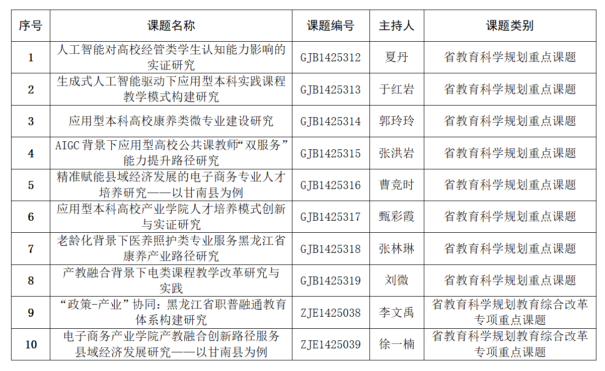 日前,黑龙江省教育科学规划领导小组公布2025年度省教育科学规划课题立项名单,威尼斯官网成功获批10项重点课题,包括年度重点课题8项、教育综合改革专项课题2项。