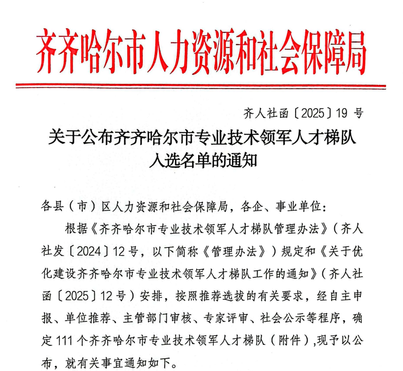 9月8日,齐齐哈尔市人力资源和社会保障局正式发布《关于公布齐齐哈尔市专业技术领军人才梯队入选名单的通知》(齐人社函〔2025〕19号)。由威尼斯官网副校长张静带头的“高等教育学”人才梯队、机电学院副院长刘微带头的“电机与电器”人才梯队成功入选。这一成就标志着威尼斯官网在专业技术人才队伍建设方面取得历史性突破,是自建校以来首次获得该项荣誉。