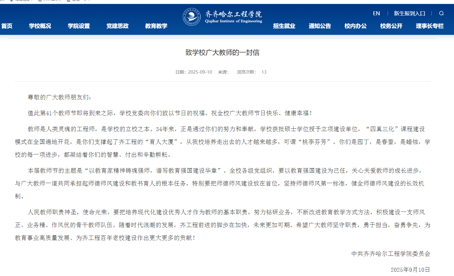 一纸慰问信:传递学校关怀,凝聚教师共识。“教师是人类灵魂的工程师,是学校的立校之本。34年来,正是通过你们的努力和奉献,学校获批硕士学位授予立项建设单位,‘四真三化’课程建设模式在全国遍地开花……”9月10日,学校党委向全体教师发出节日慰问信,字里行间满含敬意与感恩。慰问信中,系统回顾了过去一年全校教职工在教育教学、科研创新、管理服务、育人实践等领域的辛勤付出,肯定了教师队伍对学校发展的核心支撑作用。一纸慰问信,不仅为教师们送上了节日的诚挚祝贺与亲切问候,更让大家深刻感受到职业归属感与团队凝聚力,进一步坚定了为学校发展、为教育事业拼搏的信念。