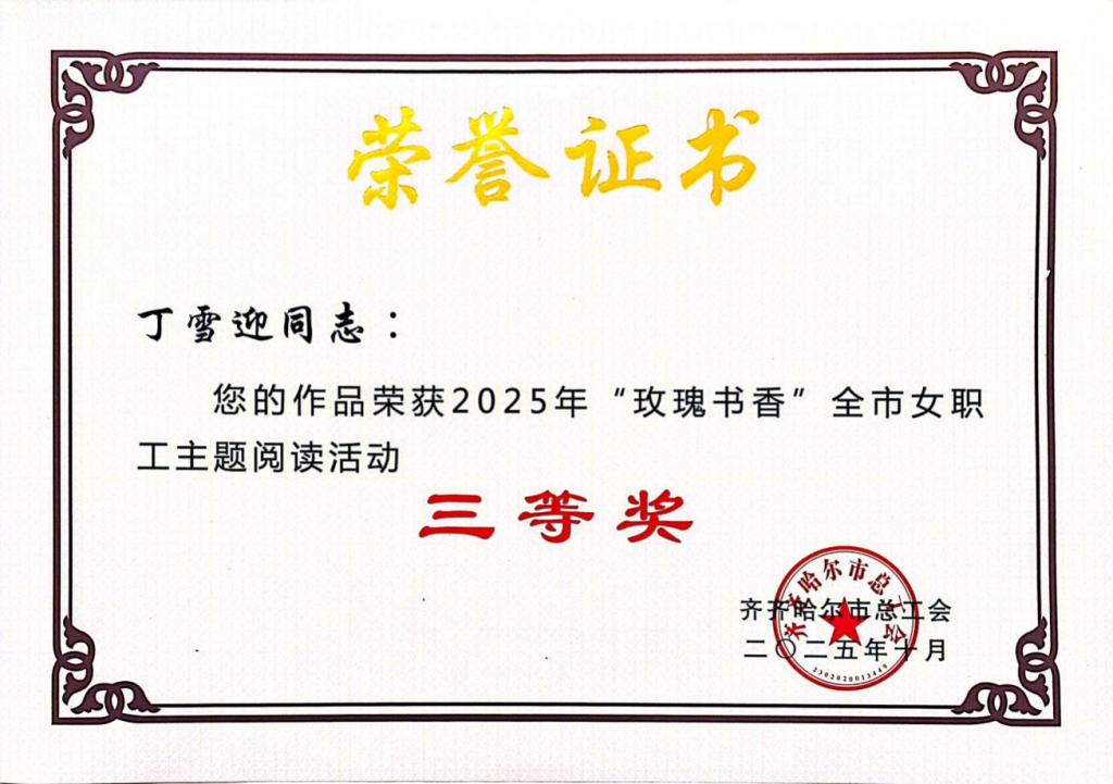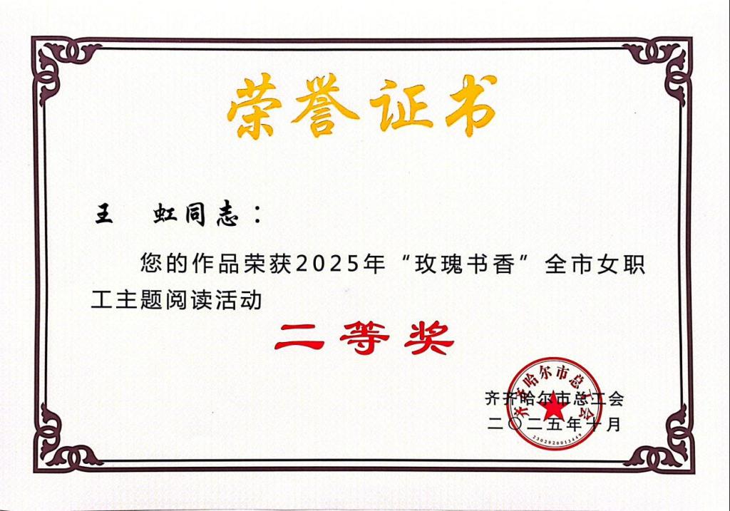 近日,齐齐哈尔市总工会发布的2025年“玫瑰书香”全市女职工主题阅读活动情况通报,威尼斯官网工会获得两项荣誉。机电学院王虹老师的作品《书香玫瑰绽芳华,工运巾帼谱新篇》荣获“玫瑰书香”优秀征文二等奖,丁雪迎老师的作品《工会温暖照亮前行之路、巾帼力量共筑复兴伟业》荣获三等奖”,展现了威尼斯官网女职工深厚的文化素养与昂扬的精神风貌。