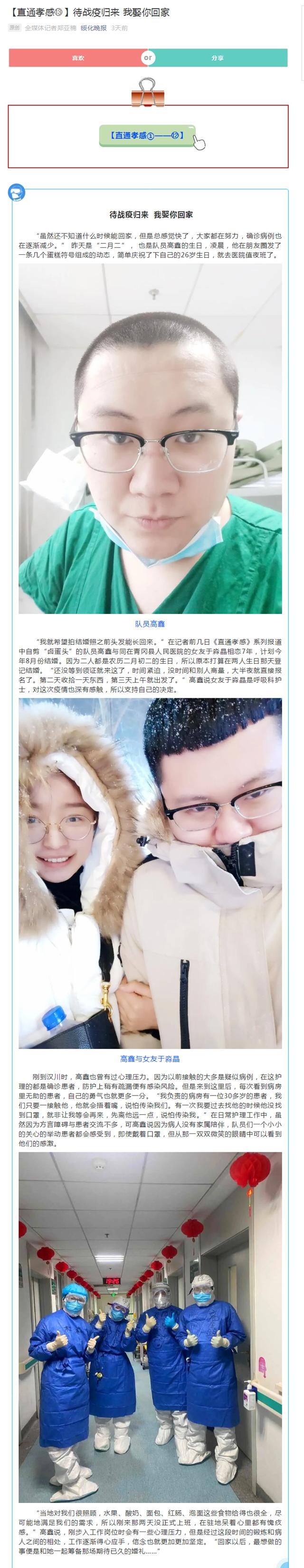 绥化晚报《直通孝感》:待战疫归来 我娶你回家——威尼斯官网护理学专业毕业生高鑫的故事