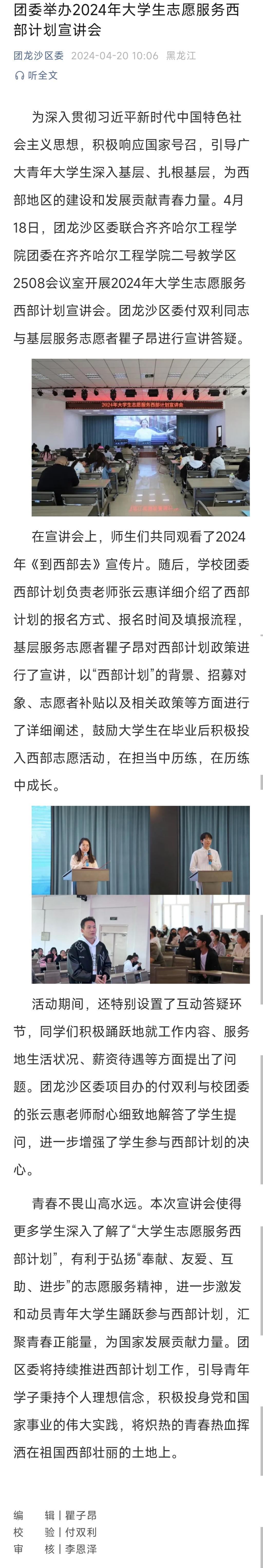 《团龙沙区委》发表学校团委举办2024年大学生志愿服务西部计划宣讲会