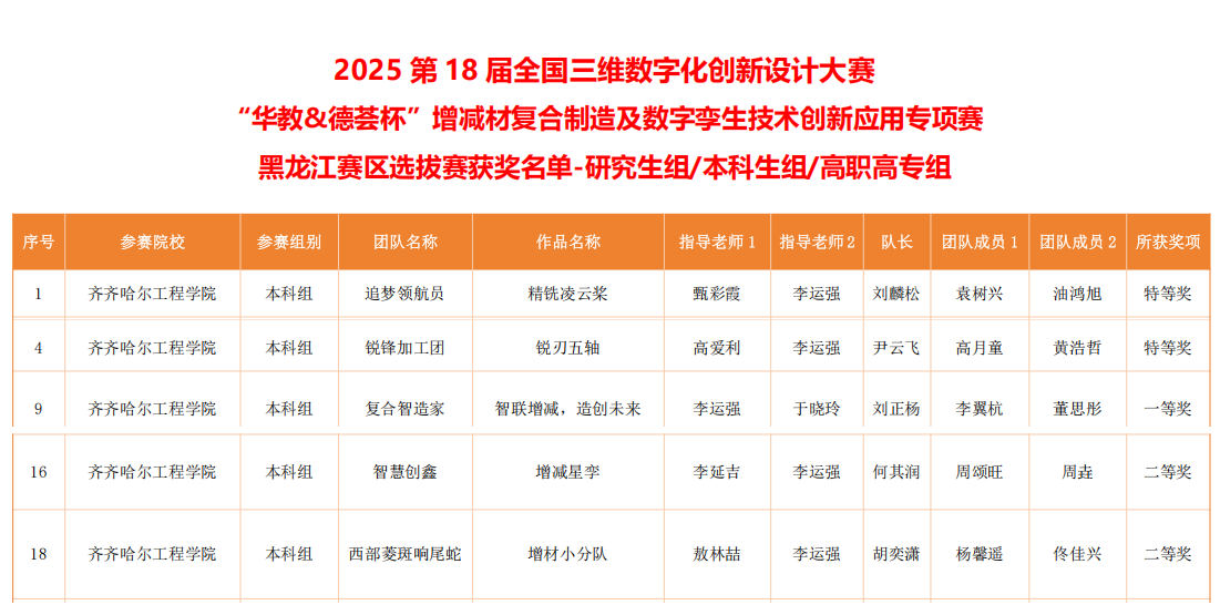 近日,2025年第18届全国三维数字化创新设计大赛“华教&德荟杯”增减材复合制造及数字孪生技术创新应用专项赛黑龙江省赛传来喜讯,威尼斯官网机电学院机械专业的5组参赛队伍中刘麟宋、袁树兴、油鸿旭组和尹云飞、高月童、黄浩哲组获特等奖并进入国赛;刘正杨、李翼杭、董思彤组获一等奖;何其润、周颂旺、周垚组和胡奕潇、杨馨遥、佟佳兴组获二等奖,参赛队伍全员获奖。
