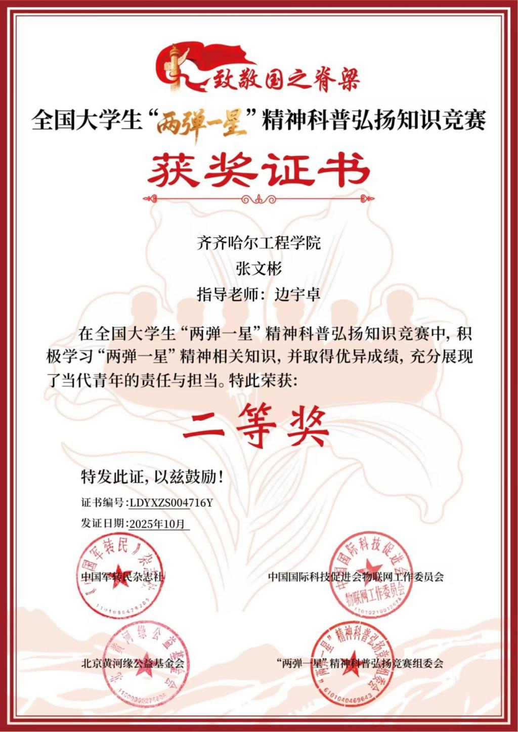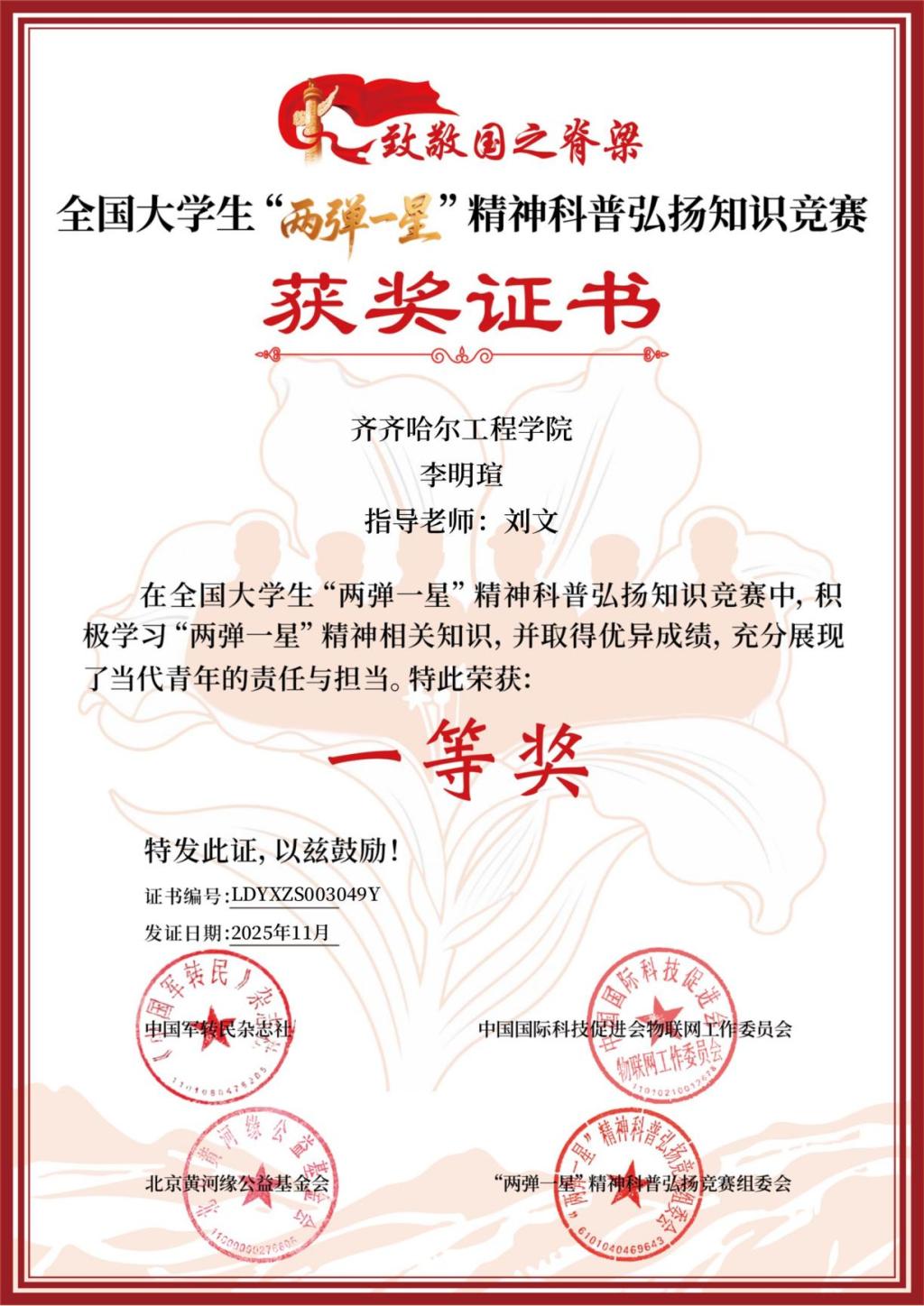 “两弹一星”精神所蕴含的科学态度与报国信念,是课程思政建设的宝贵资源。组织学生参与本次赛事,既是大学物理教研室推进课程思政的生动实践,也是学校落实立德树人根本任务的具体举措。通过“以赛促学”,学生在竞技中深化了对精神内涵的理解,实现了思政教育与专业学习的深度融合。未来,大学物理教研室将继续立足学科特色,引导学生在掌握科学知识的同时,坚定理想信念、厚植家国情怀,努力成长为担当民族复兴大任的时代新人。